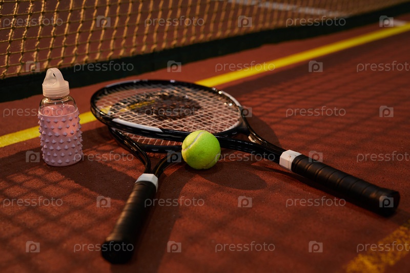 Близкий план современных теннисных ракеток, мяч и розовая бутылка с водой лежат у сетки на полу в темном корте, копирование пространства