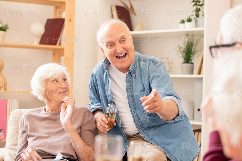 Счастливый старший мужчина с флейтой шампанского, указывая на своего друга