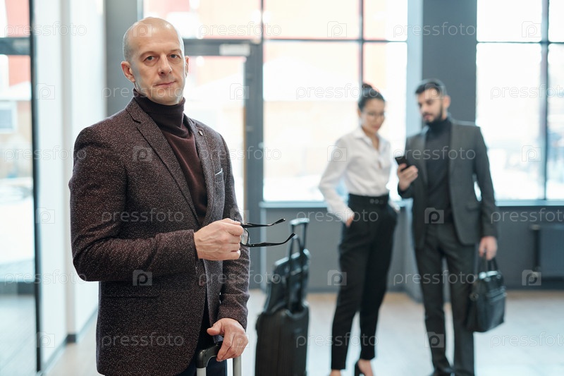 Уверенный зрелый мужской бизнес-путешественник с очками и чемоданом
