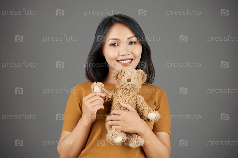 Счастливая женщина с плюшевым медведем