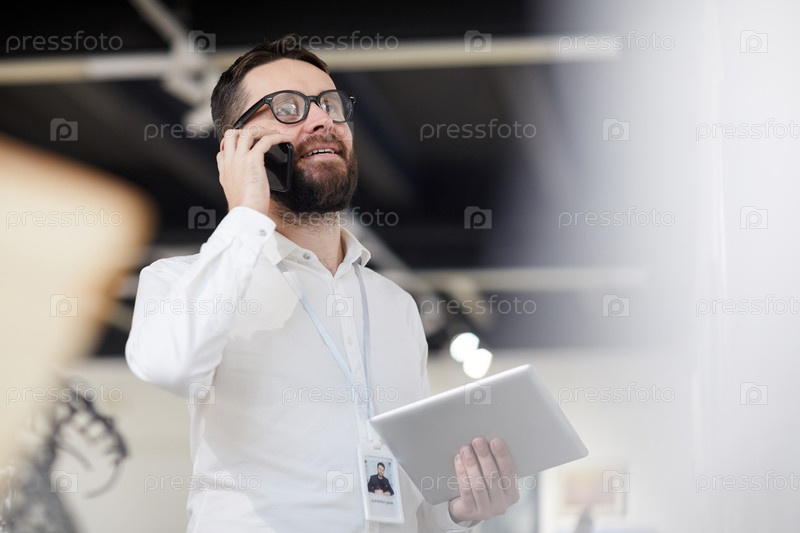 Бородатый менеджер говорит по телефону в художественной галерее