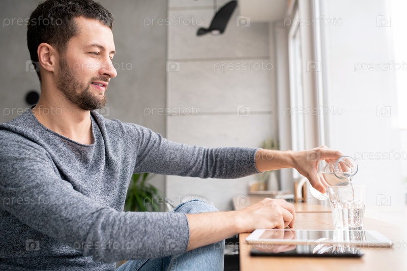 Случайный мужчина сидит у окна в кафе и наливает воду из бутылки в стакан