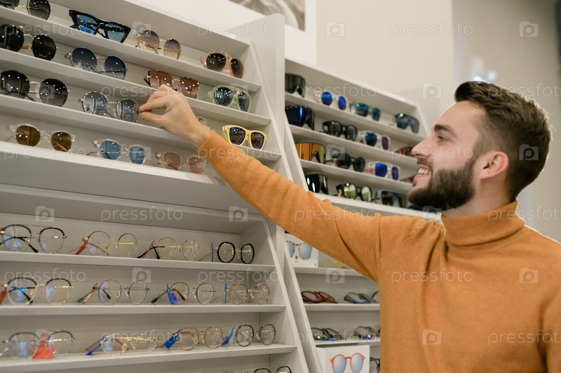 Счастливый молодой человек берет пару стильных очков с дисплея очки
