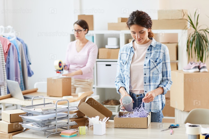 Красивый молодой менеджер интернет-магазина, упаковывающий кружку в картонную коробку