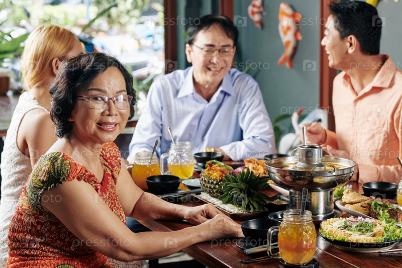 Пожилая женщина посещает семейный ужин