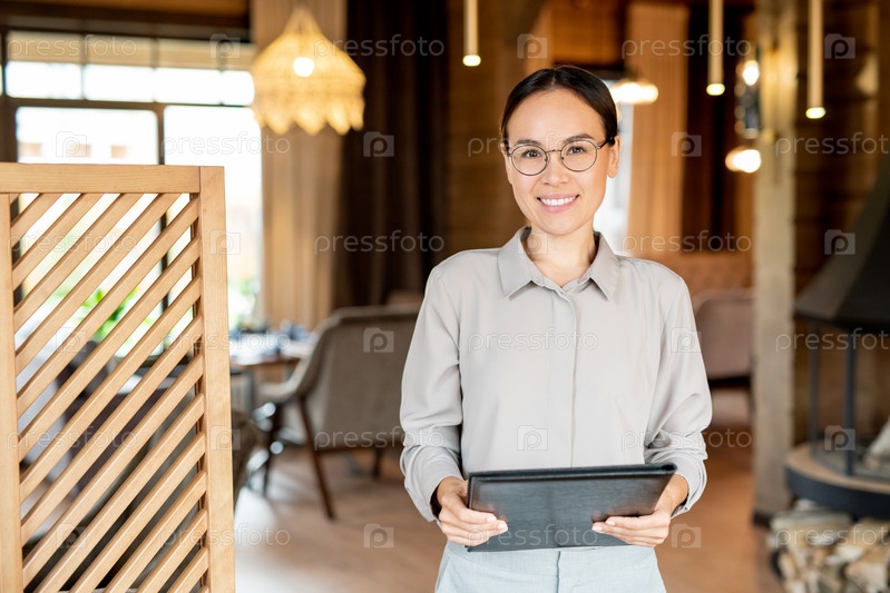 Молодая улыбающаяся деловая женщина азиатской этнической принадлежности, держащая документ
