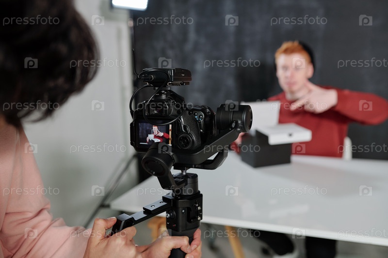 Видеооператор держит камеру перед влогером, открывающим черный ящик в студии