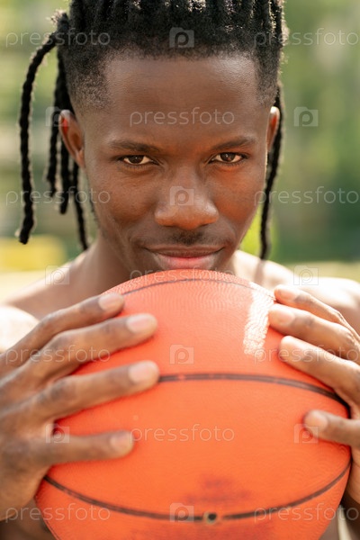 Молодой успешный спортсмен, держащий мяч для баскетбола по лицу