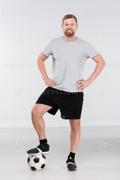 Молодой профессиональный футболист с ногой на мяче стоит перед камерой
