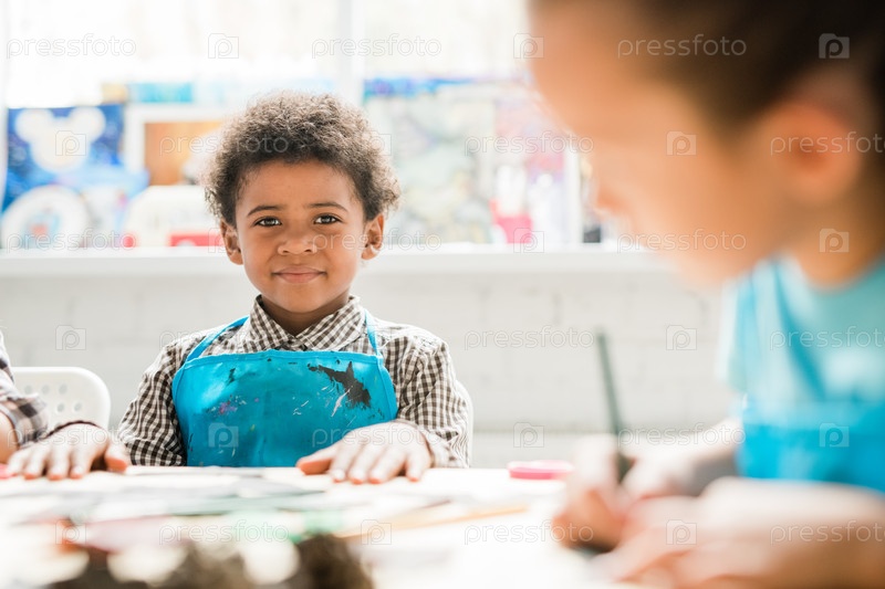 Милый школьник африканской этнической принадлежности в синем фартуке, сидящий у столов на уроке