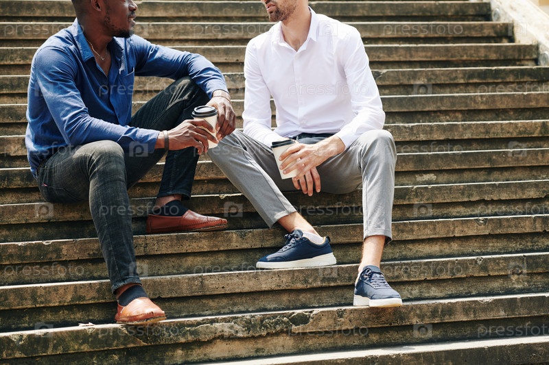 Бизнесмены, отдыхающие на ступеньках во время перерыва на кофе