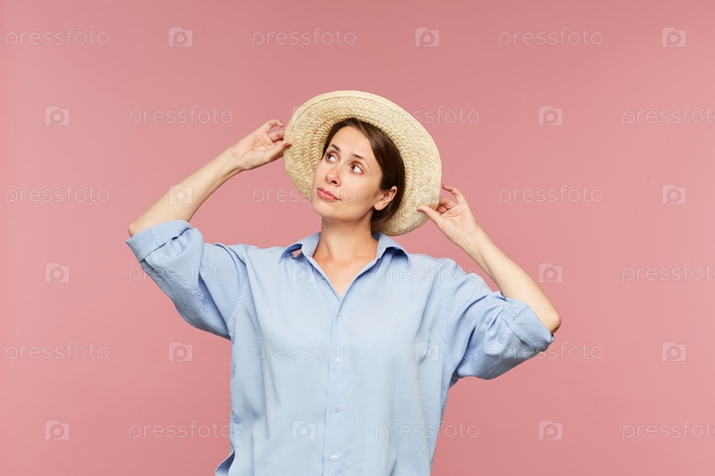 Красивая молодая женщина в синей рубашке пробует новую шляпу