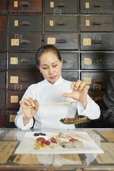 Врач традиционной медицины взвешивает сухие ингредиенты