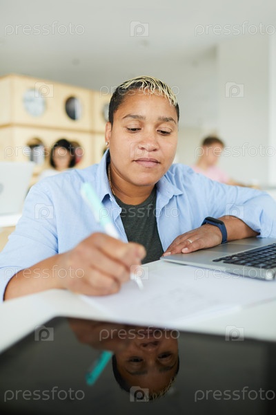 Афроамериканский студент делает заметки в учебнике
