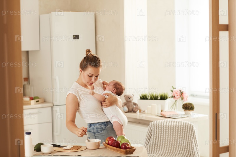 Ранний завтрак занятой матери в белой футболке, которая пытается съесть быстро, держа своего ребенка