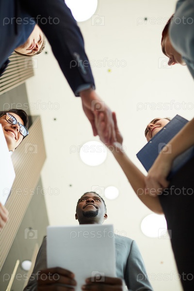 Бизнесмены, рукопожатые в офисе