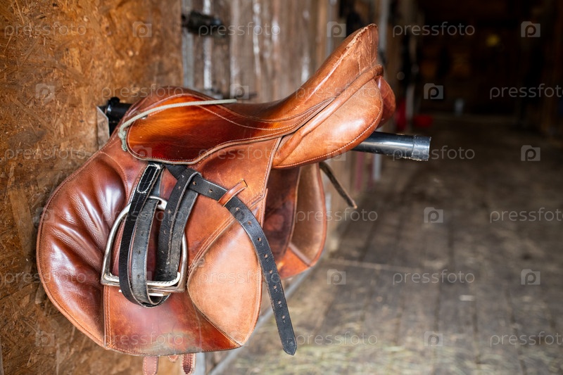 Коричневое хрупкое кожаное седло с черными уздечками, висящим на стальной стойке