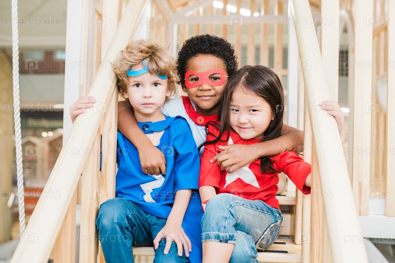 Группа нежных маленьких друзей разных этнических групп, сидящих на лестнице