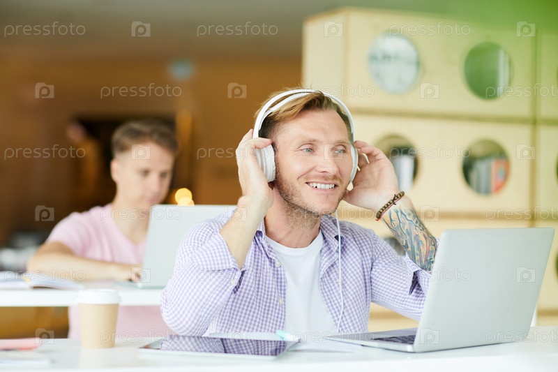 Позитивный парень в наушниках работает над проектом в библиотеке