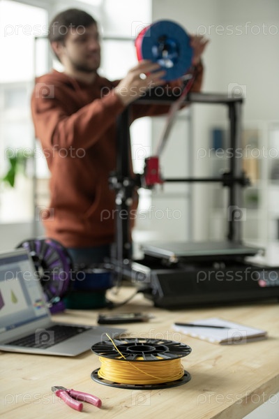 Катушка с желтой нитью и клинками на рабочем месте креативного дизайнера