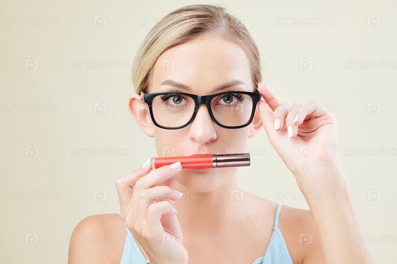 Красивая женщина с блеском на губах и очками