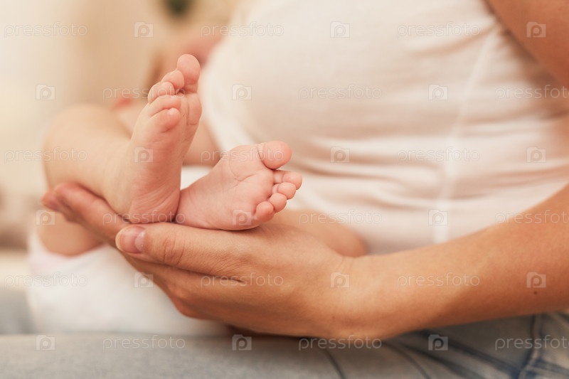 Мать кормит новорожденную девочку и касается ее маленьких ножек, селективный фокус
