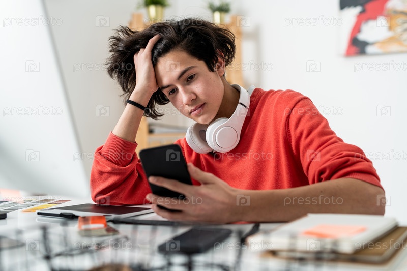 Спокойный фрилансер со смартфоном, смотрящий любопытные вещи во время перерыва