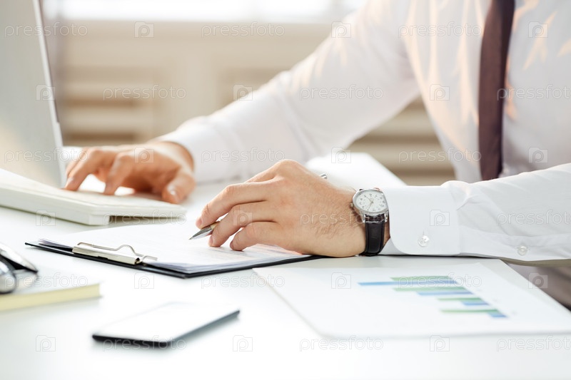 Близкий план неузнаваемого финансового аналитика, сидящего за рабочим столом и читающего запрос на электронную почту во время проверки текста контракта