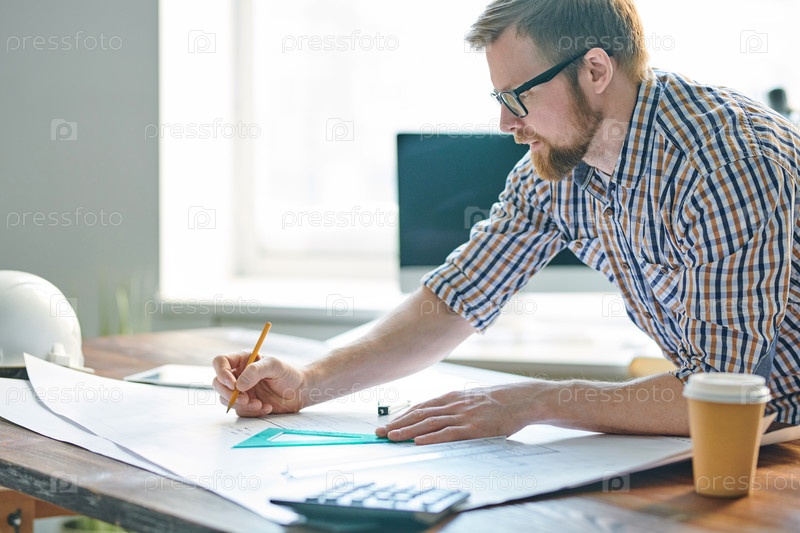 Серьезный современный инженер в очках, стоящий за столом и делающий точки на чертеже во время работы в строительной компании