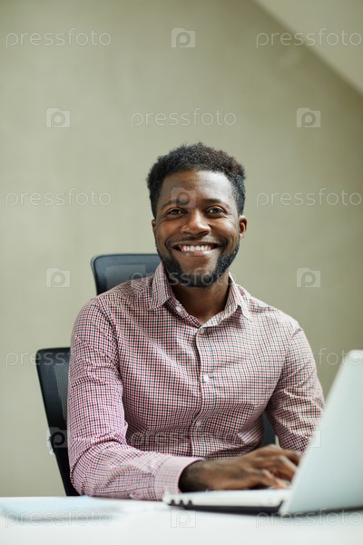 Портрет позитивного молодого бородатого афроамериканского ИТ-инженера, сидящего перед ноутбуком в современном офисе