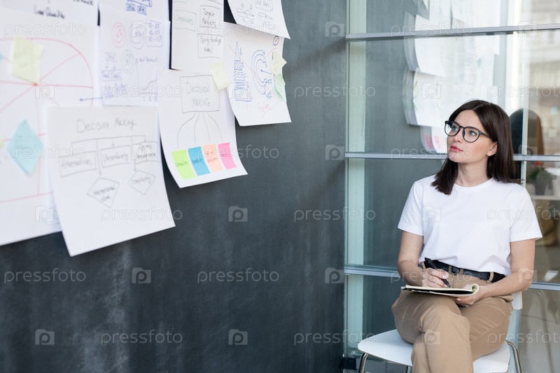 Красивая молодая студентка или бизнес-леди, сидящая на стуле и делающая заметки