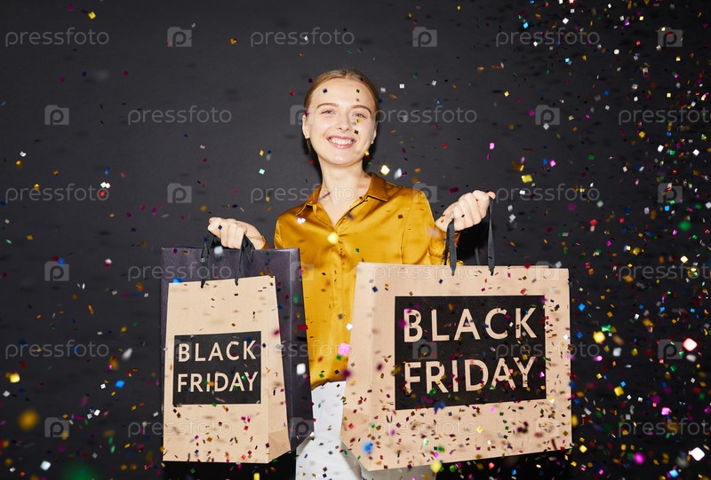 Портрет веселой красивой девушки в элегантной блузке, развлекающейся на вечеринке 'Черной пятницы': она держит бумажные пакеты под дождем конфетти