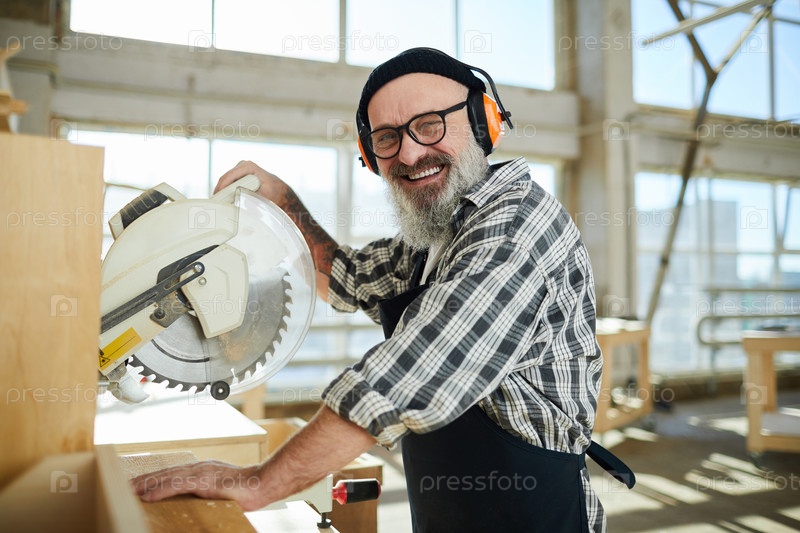 Весело взволнованный старший бородатый мужчина с защитниками для ушей и очками смеется, держа доску и работая на пиле