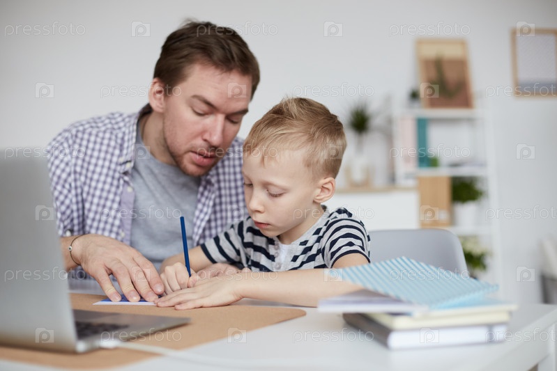 Серьезный молодой отец с соломинкой сидит за столом в комнате и рассматривает решение задания, которое его сын записывает в учебник