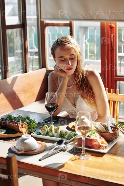 Женщина ждет своего парня в ресторане