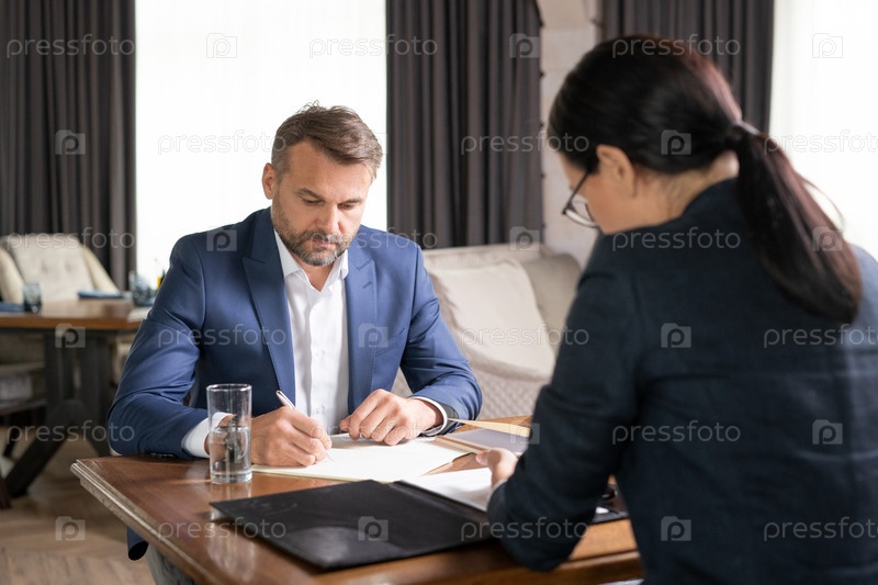 Серьезный бизнесмен и его коллега работают за столом в ресторане
