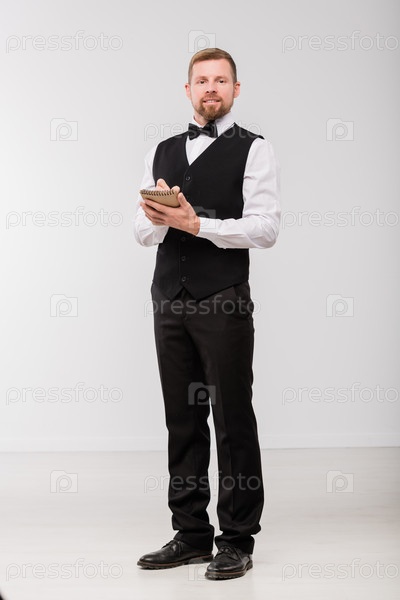 Молодой элегантный официант с блокнотом и ручкой, записывающий заказ одного из клиентов