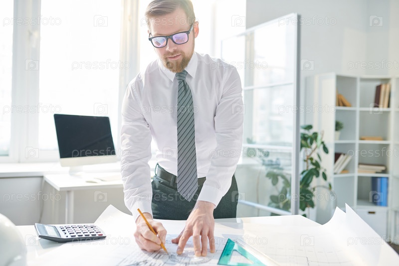 Контент занятый красивый молодой бородатый инженер в очках, стоящий за столом и использующий линейки для создания технического эскиза, он работает в офисе