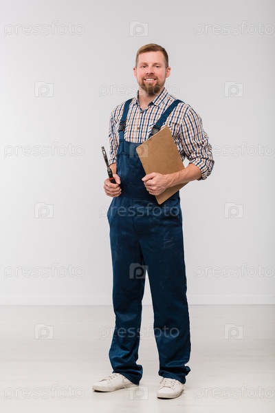 Счастливый молодой механик в комбинезонах и рубашке, держащий клипборд и инструмент