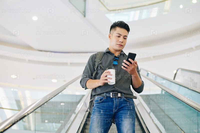 Студент университета стоит на эскалаторе