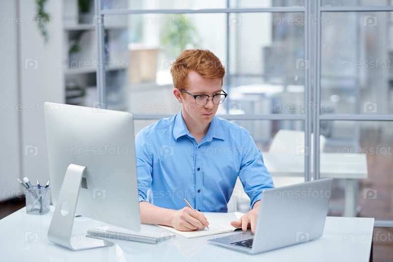 Молодой программист просматривает программное обеспечение на дисплее ноутбука