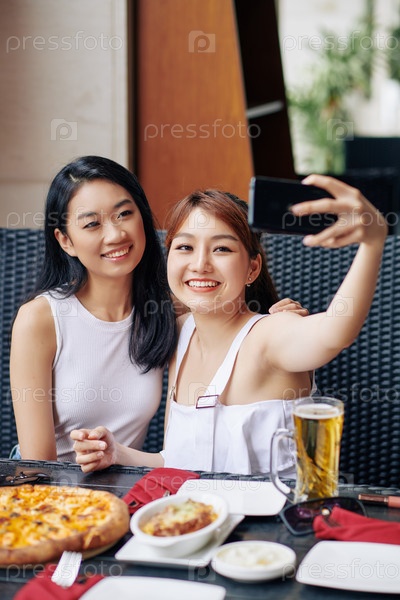 Друзья делают селфи в кафе