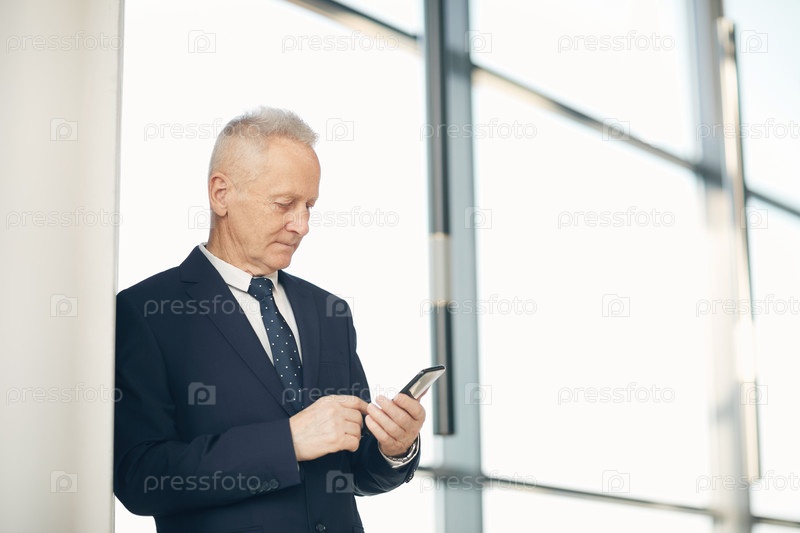 Серьезный занятый седой бизнесмен в темном костюме, опирающийся на стену в современном лобби с панорамными окнами и делая заметки со смартфона