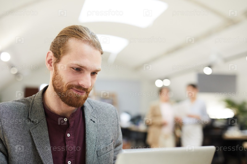 Улыбающийся бизнесмен работает в офисе открытого пространства