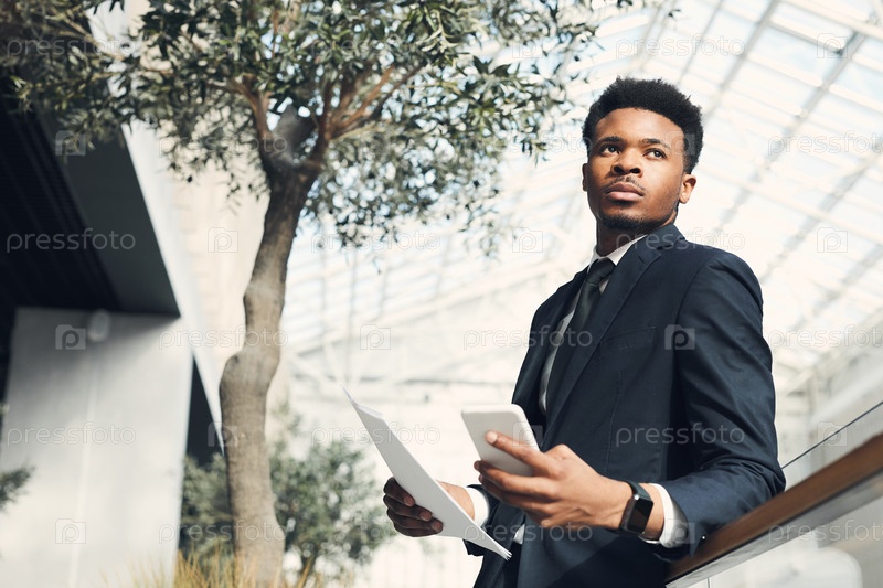 Уверенный молодой чернокожий бизнесмен в формальном куртке, опирающийся на перила в современном лобби с деревьями и планируя прибыльный бизнес-проект