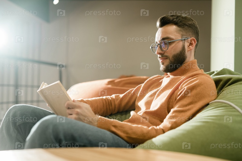 Молодой расслабленный мужчина в повседневной одежде и очках читает книгу на удобном диване