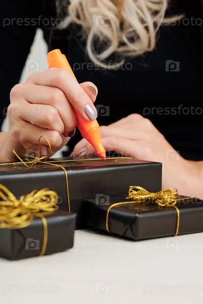 Женщина подписывает подарок на Хэллоуин