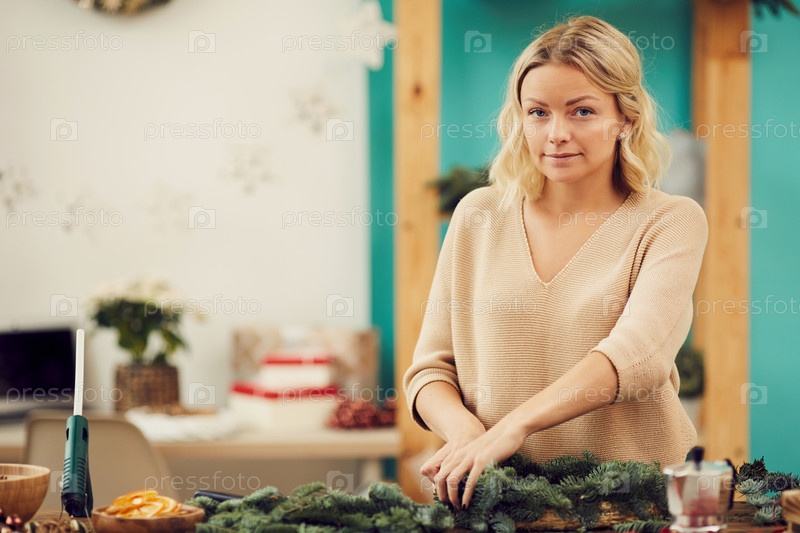 Портрет контента Красивая женщина-ремесленница с волнистыми светлыми волосами, работающая в студии рождественских венков