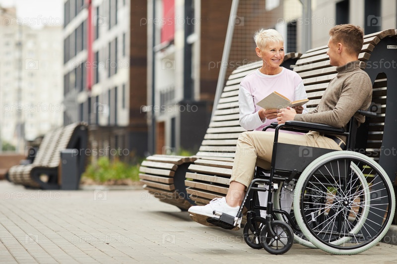 Оптимистичный молодой человек сидит в инвалидной коляске и слушает, как опекун читает интересную книгу громко на улице