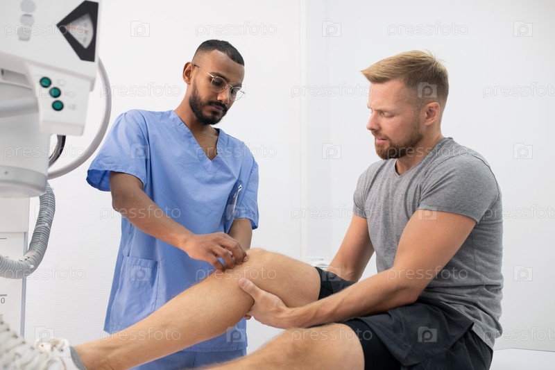 Молодой врач в форме массажирует больное колено одного из пациентов в больнице